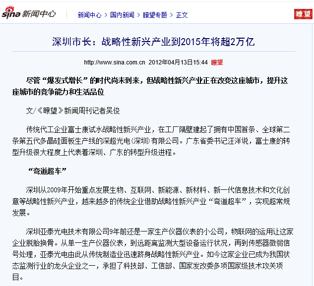 深圳市經濟貿易和信息化委員會相關負責人在接受《瞭望》新聞周刊記者采訪時說,過去一年,深圳經濟最引人注目的亮點就是戰略性新興企業的迅速崛起,涌現出一大批高成長的自主創新企業。