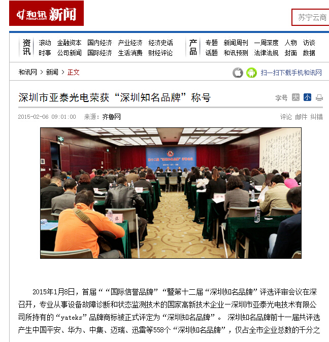 2015年1月8日,首屆““國際信譽品牌”“暨第十二屆“深圳知名品牌”評選評審會議在深召開,專業(yè)從事設(shè)備故障診斷和狀態(tài)監(jiān)測技術(shù)的國家高新技術(shù)企業(yè)—深圳市亞泰光電技術(shù)有限公司所持有的“yateks”品牌商標(biāo)被正式評定為“深圳知名品牌”。 深圳知名品牌前十一屆共評選產(chǎn)生中國平安、華為、中集、邁瑞、迅雷等558個“深圳知名品牌”,僅占全市企業(yè)總數(shù)的千分之一。