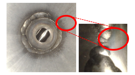 圖片:2.8 毫米雙視圖視頻內窺鏡位于 ?” 內徑燃油歧管管道內。左圖顯示針對目標軌道焊縫的前向視圖 (DOV)。右圖顯示針對焊縫的側向 DOV。這顯示了可能存在問題的不一致焊道。